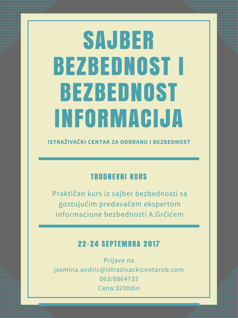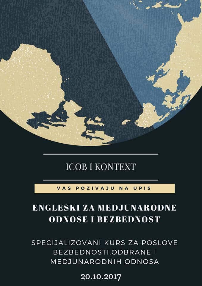 OTVOREN UPIS POLAZNIKA! Trajanje 35 časova- dva meseca Početak kursa 20. oktobra Cena: 150 € Mogućnost plaćanja u dve rate. Popust za studente. Ovakav tip kursa je jedinstven u našoj državi. Ne postoji mogućnost da negde drugo pohađate specijalizovani kurs engleskog iz medjunarodnih odnosa i bezbednosti. Ovaj jedinstveni kurs je namenjen studentima bezbednosti, političkih nauka, Kriminalisticko-policijske akademije, Vojne akademije i drugih fakulteta vezanih za ovu materiju. Zaposlenima u drzavnim subjektima bezbednosti i privatne bezbednosti i svim onima koji se bave ili planiraju da se bave poslovima bezbednosti, odbrane, inostranim poslovima, diplomatijom, itd… Glavni cilj kursa jeste da se polaznici upoznaju sa ovim tipom engleskog . Nije potrebno posebno naglašavati da engleski u ovoj tematici nije dovoljno zastupljen u formalnom obrazovanju, a imperativ je za rad u državnim i međunarodnim institucijama, multinacionalnim kompanijama itd.. Predavači su nastavnici i prevodioci u vrhu strukture Sistema Bezbednosti i Odbrane Repubike Srbije Prijave na